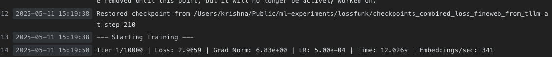 this seems like the basic formula used everywhere to find a new one i would have to map shit which i can’t right now so let’s not it might very well be that i would need to just use MSE at the end but nothing wrong in checking perphaps starting with α = 0.7 (cosine usually gives bad performance so we keep it less) this was a bust also despite a promising loss curve it weirdly never converges to the actual data only outputs one embedding for a while so ig this is not it